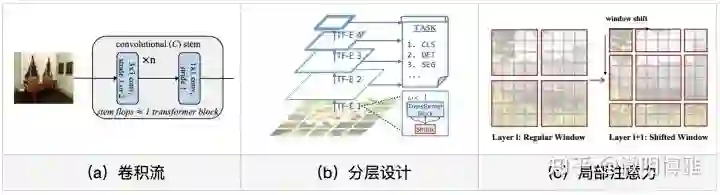 但问题也随之而来,ViT是最优的结构吗?真的需要这么多数据吗?在ViT的原始论文中已经揭露了许多问题,比如大模型对优化的选择非常敏感,同时需要更多的数据。对于优化问题,已经有人提出用卷积流代替patch流,在早期更有效地编码局部特征,这种方式不仅解决了优化问题同时提升了性能。对于数据量,DeiT和SwinT已经给出了一种数据有效性的ViT模型,但其中或多或少都引入了卷积的inductive bias,这不得不使我们重新考虑ViT结构:卷积流、分层设计甚至局部注意力。