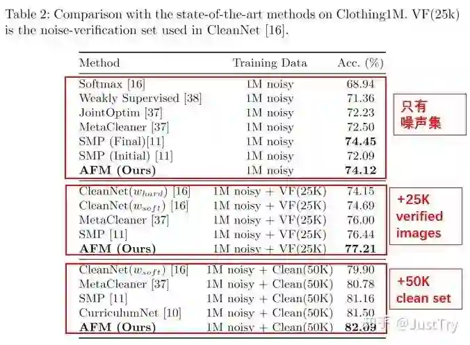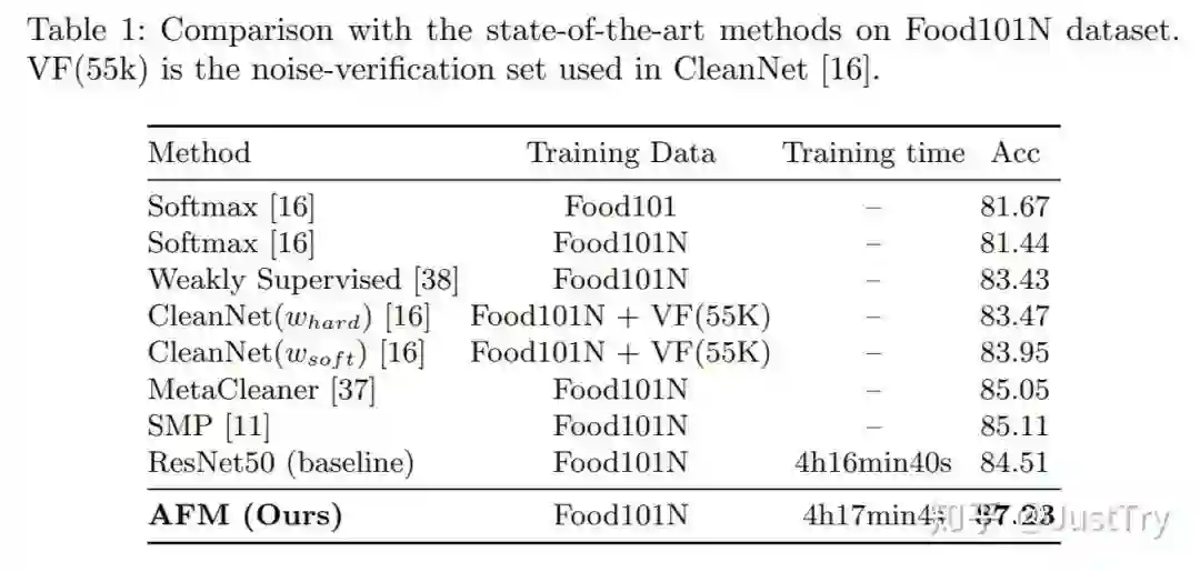 作者在Food101N(标签准确度为80%)和Clothing1M(标签准确度为61.54%)进行训练,得到的结果增强了。(注:Clothing1M在只有噪声集下训练结果虽然不是最优,但是模型复杂度和计算复杂度比SMP(Final)低)