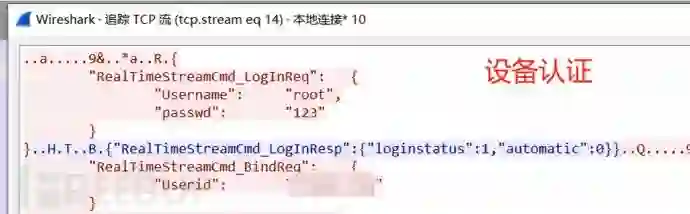 继续分析下流量,可以看到设备与云端认证和的过程及绑定用户信息,而且弱口令认证设备。