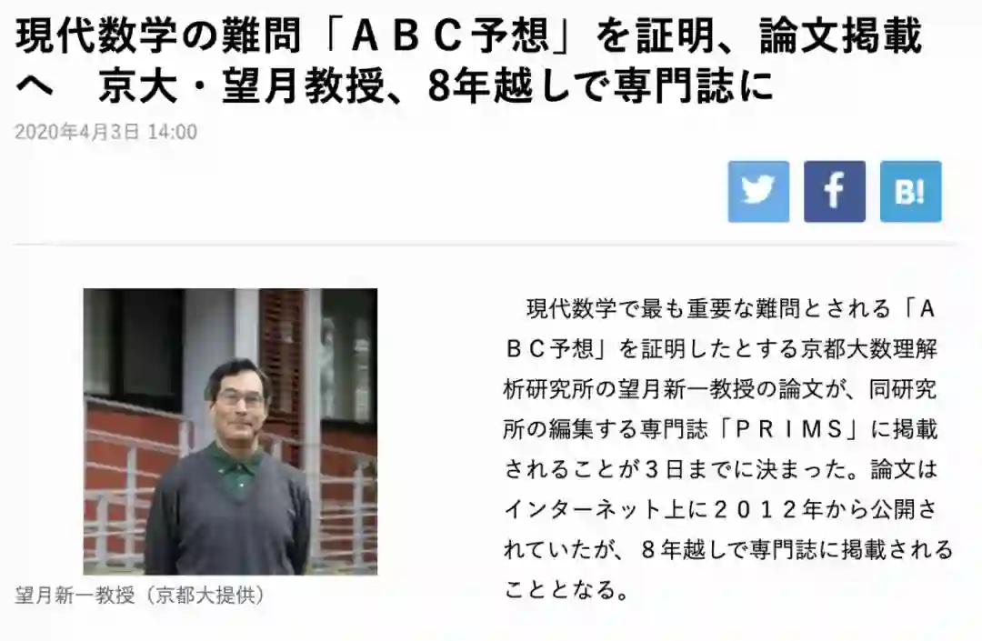 4 月 3 日,日媒京都新闻报道,日本京都大学数理分析研究所教授望月新一(Shinichi Mochizuki)对于数论难题「abc 猜想」的证明近日将正式发表。从公布之日算起,该论文已经经历了近 8 年的审查。《自然》杂志随后也跟进报道了这一消息。