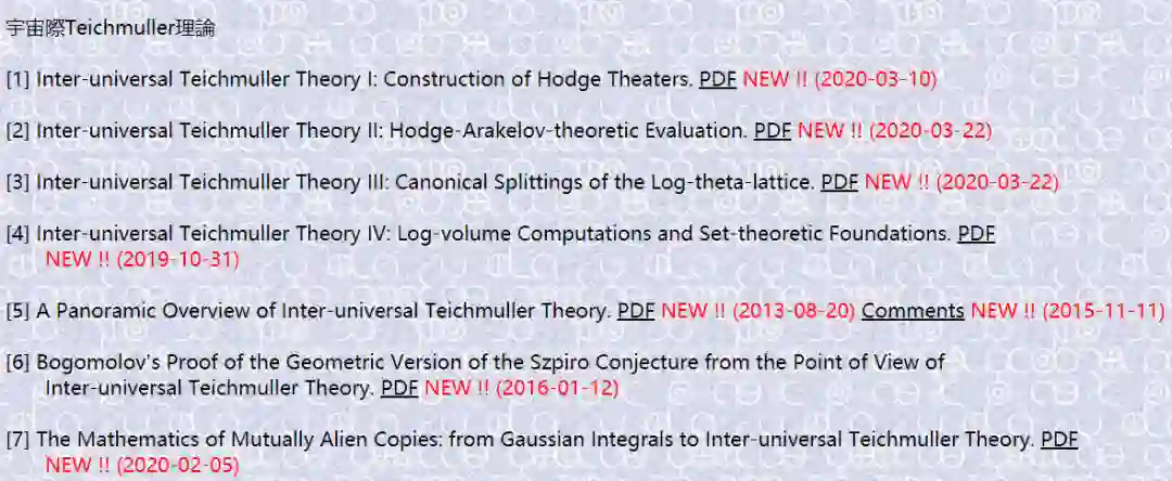 虽然望月新一很少出面解读自己的工作,但近年来随着人们的努力消化,指出错误,论文已经过了不断修订。在望月新一的个人网站上,我们看到「宇宙際Teichmuller理論」系列论文预印版最近得到了更新: