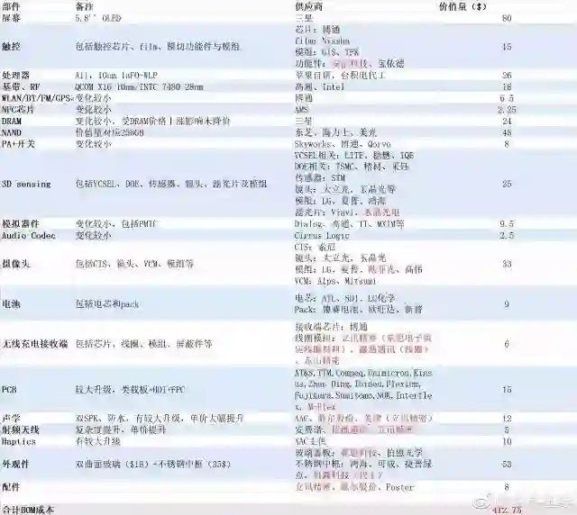 除此之外,iPhone X在摄像头方面的成本也比较高,包括CIS、镜头、VCM、模组等在内的成本价格为33美元,至于供应商则数量众多。其中,CIS由索尼供货,镜头则是大立光和玉晶光,模组供应商则分别是LG、欧菲光、厦普、高伟,至于VCM则由Alps和Mitsumi供货。