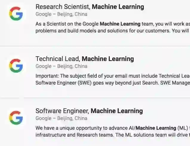 今年下半年,有细心的网友已发现Google正在中国招募AI方向人才。根据招聘信息显示,主要招聘的岗位集中在机器学习领域,包括机器学习研究员、机器学习技术主管、云端机器学习产品经理等。