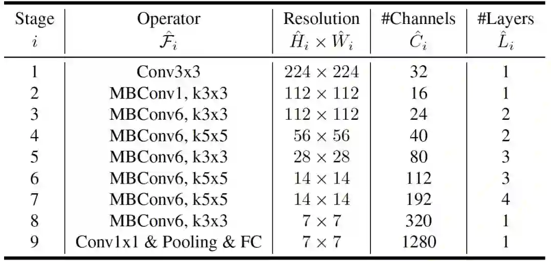 作者通过利用多目标神经架构搜索来开发基线网络,以优化准确性和 FLOPS。具体来说,使用 ACC(m)x[FLOPS(m)=T]^w 作为优化目标,其中 ACC(m) 和 FLOPS(m) 表示模型 m 的精度和 FLOPS,T 是目标 FLOPS,w=-0.07 是控制精度和 FLOPS 之间折衷的超参。优化 FLOPS 而不是延迟,因为我们不针对任何特定的硬件设备。搜索生成一个高效的网络,称之为 EfficientNet-B0。结构如下: