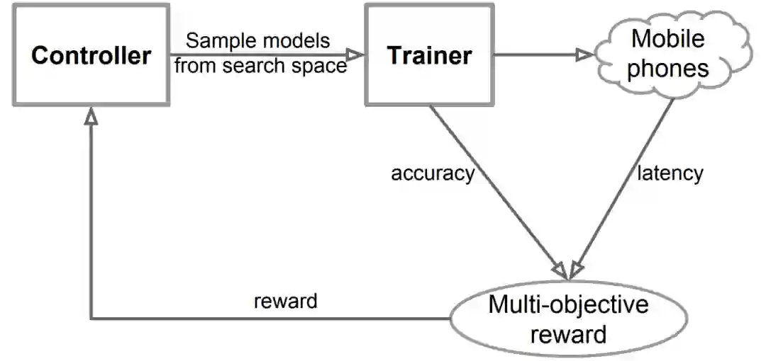 搜索框架由三部分组成:循环神经网络控制器,一个训练器获得模型精度和移动推理引擎获得模型推理延迟。在每一步中,控制器使用它现在的参数采样一组模型,基于 RNN的 softmax logits 预测一组 tokens。对于每个采样模型 m,在目标任务上训练,计算精度 ACC(m),在平台上运行模型获得推理延迟 LAT(m),根据目标函数计算奖励值 R(m)。在每一步的最后,最大化期望奖励来更新控制器参数。一直循环到达到最大的步数或参数收敛。