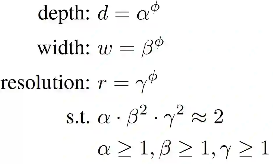 其中 α , β , γ 是通过一个小网格搜索的方法决定的常量。通常来说,ϕ 是一个用户指定的系数来控制有多少的额外资源能够用于模型的缩放,α , β , γ 指明了怎么支配这些额外的资源分别到网络的宽度、深度和分辨率上。尤其是,一个标准卷积操作的运算量的比例是 d , w^2 , r^2 双倍的网络深度将带来双倍的运算量,但是双倍的网络宽度或分辨率将会增加运算为 4 倍。