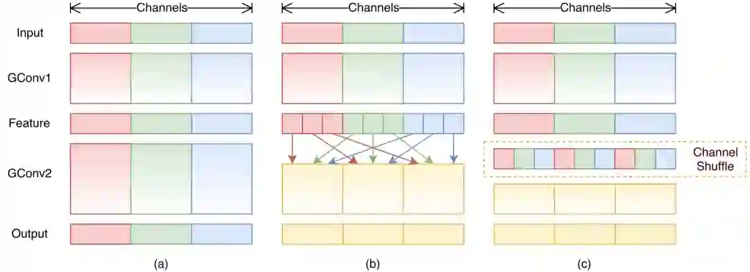 图2 用两个堆叠的分组卷积进行通道混洗。GConv代表分组卷积。a)两个堆叠的卷积层,分组数相同。每个输出通道只与组内的输入通道有关。没有交叉对话;b)当GConv2在GConv1之后从不同的分组中获取数据时,输入和输出通道完全相关;c)为与b)使用通道混洗的等价实现