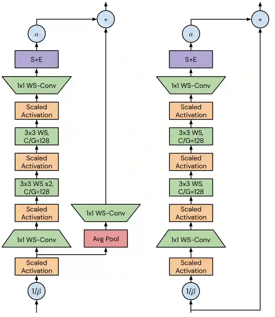 在本文的残差块中没有使用激活归一化层。相反,作者采用了 Normalizer-Free variance downscaling 策略。这意味着残差块的主路径的输入乘以 1/β,其中 β 是初始化时该块方差的分析预测值,块输出乘以一个超参 α。此外,作者还引入 SkipInit,这是一个可学习的零初始化标量增益,除了 α 之外,它将残差块初始化为 identity(除了在过渡层),作者发现这可以提高非常深的网络的稳定性。所有的卷积运算都采用 Scaled Weight Standardization,对标准化的权重采用可学习的 affine gain,对卷积运算的输出采用可学习的 affine bias。