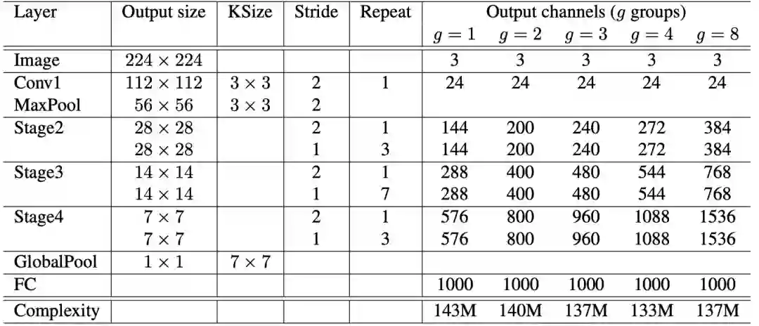 表1 ShuffleNet结构。使用FLOPs评估复杂性。对于阶段2,不在第一层逐点卷积上应用分组卷积,因为输入通道的数量相对较少
