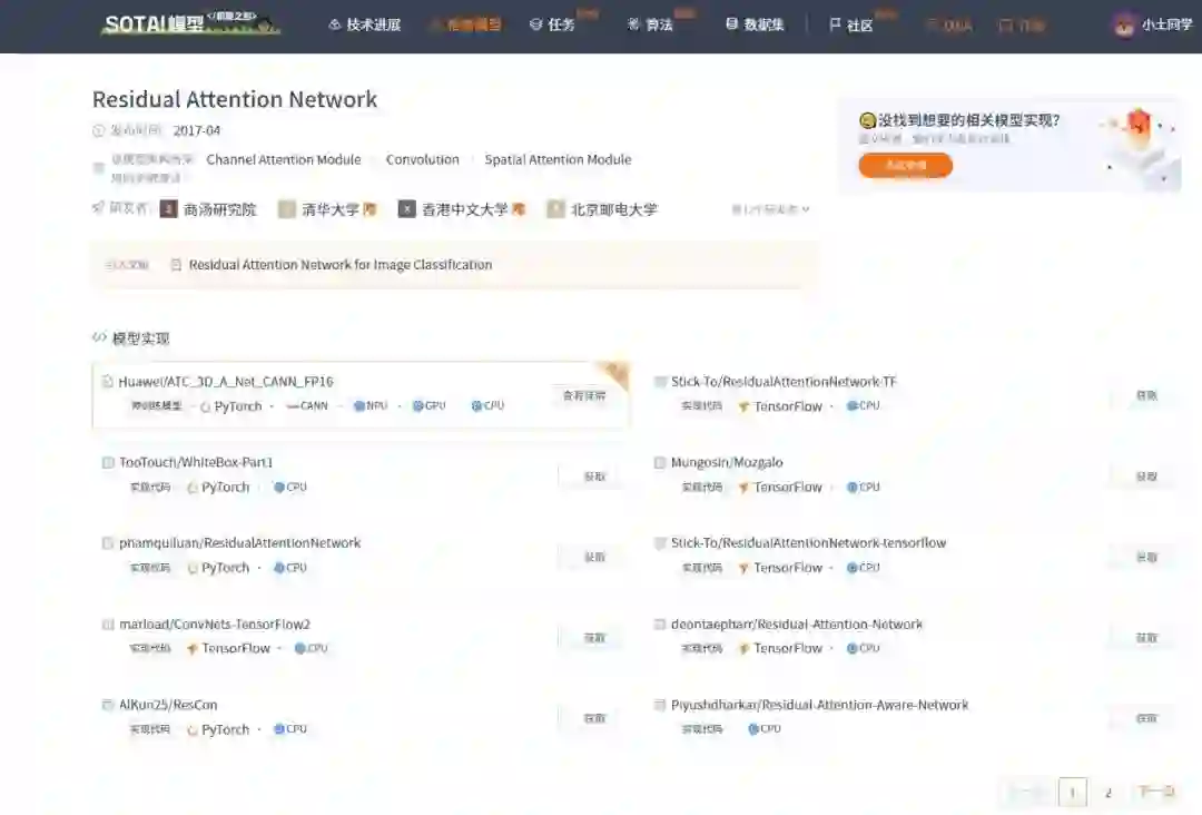 当前 SOTA!平台收录 Residual Attention Network 共 15 个模型实现资源,支持的主流框架包含 TensorFlow、PyTorch、CANN 等。