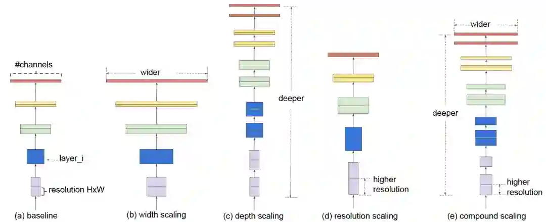 作者提出了一种新的复合缩放方法,该方法使用一个统一的复合系数 ϕ 对网络的宽度,深度和分辨率进行均匀缩放。