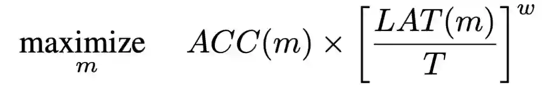 给定一个模型 m,ACC(m)表示它在目标任务上的准确性,LAT(m) 表示在目标移动平台上的推理延迟,T 是目标延迟。一个常见的方法是将 T 作为一个硬约束,并在这个约束下使精度最大化: