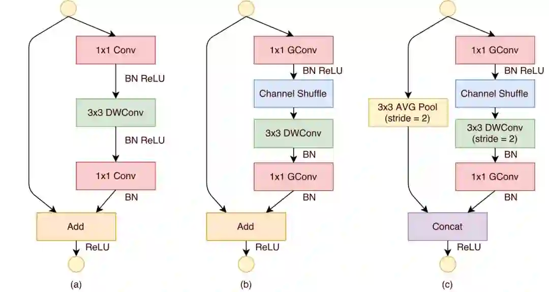 图3 a)具有深度卷积(DWConv)的瓶颈单元;b)具有逐点卷积(GConv)和通道混洗的ShuffleNet单元;c)stride=2的ShuffleNet单元