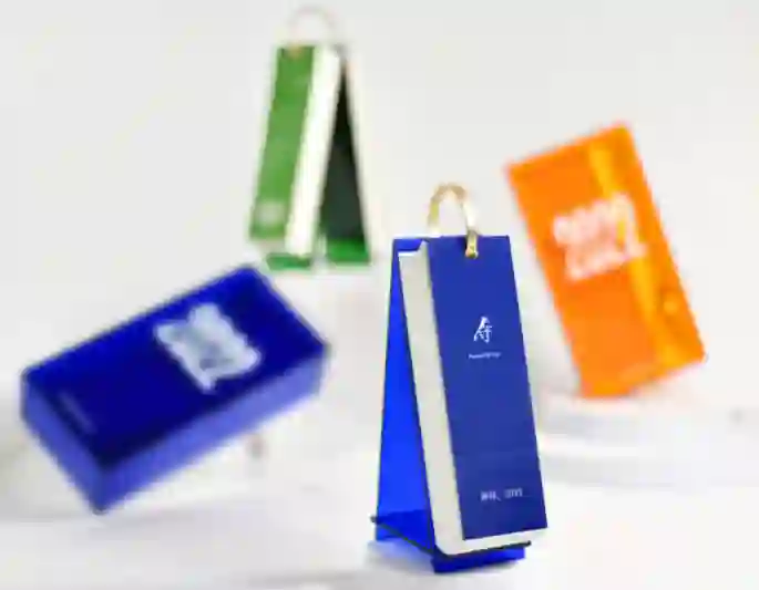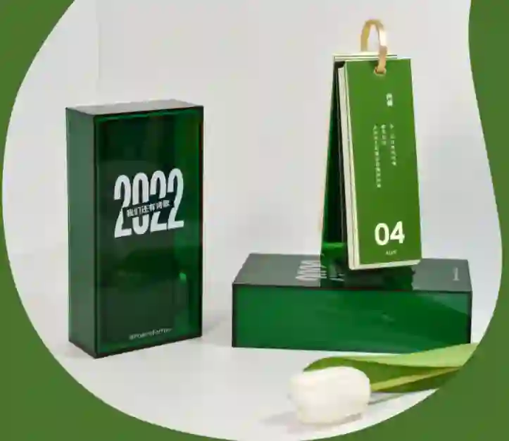 这是一款竖版的日历,造型狭长纤细。三种颜色分别是蓝色、静谧绿和落日橙,单条日历都装在相同配色的亚克力方盒内。盒子和日历本身都是一件高级的装饰。