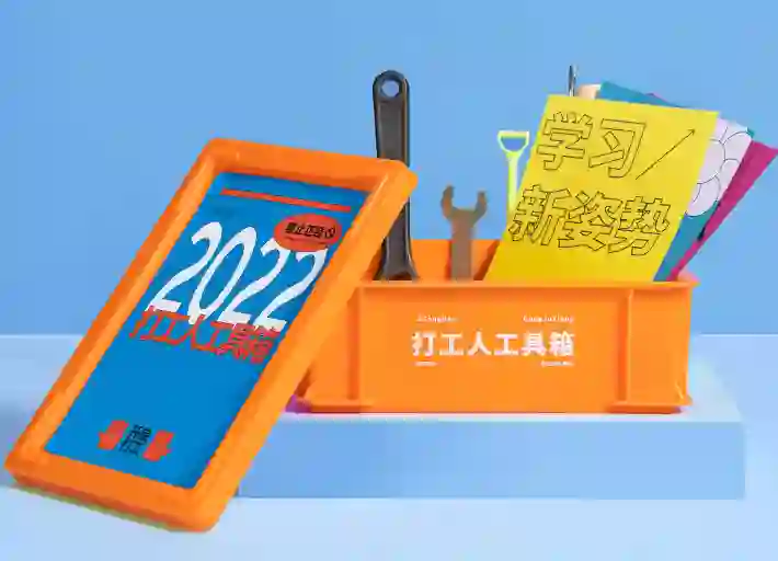 到了包装环节,《一本不正经的日历 2022》丝毫没有含糊。一个橘色的条条框框装起来这些不正经的内容,同时它也是一个打工人专用工具箱,附赠的贴纸、咸鱼翻身铲等都可以收纳其中。