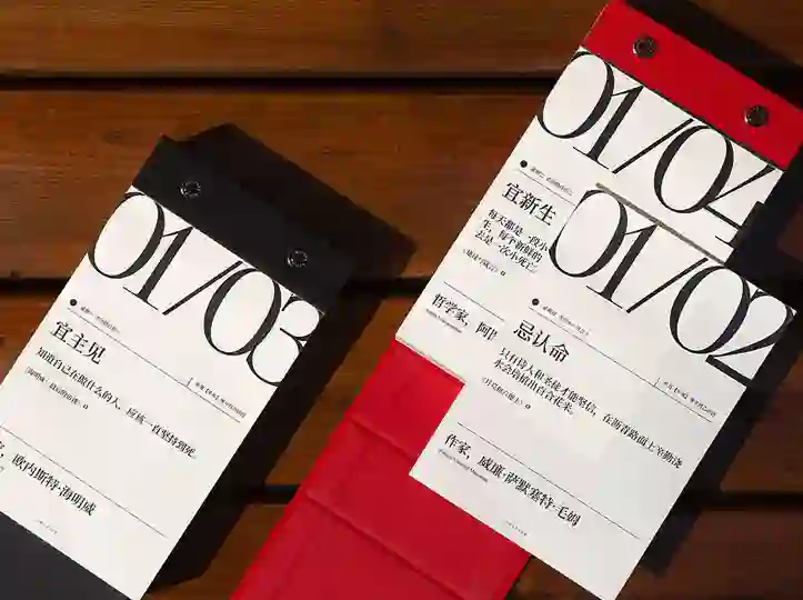 日历页也变了,日期以简约满溢的大字印刷在顶部,下方依次是传统的每日宜忌、书籍与歌词选句。到了重要的日期,还有作家与歌手的海报式日历页穿插其中,这本日历在和你对话。