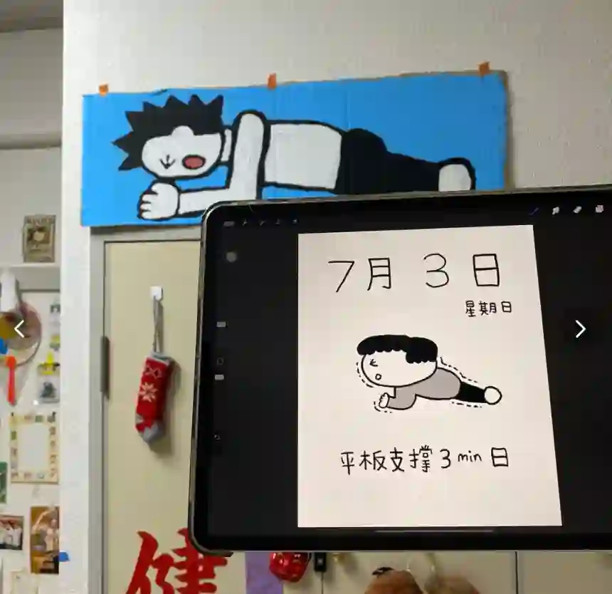 比如有一天是平板支撑3分钟日,这个灵感来自插画师墙上的卡通画。当然她也为当天的日历页画上了平板支撑的动作。