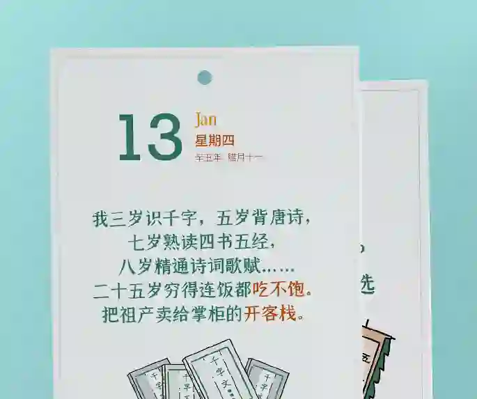《同福客栈 2022 日历》在每一天都精选了一句剧中台词,光看这文字就有画面了,难怪自称「有声日历」。所选取的句子都与当天的日期有所关联,至于到底是什么样的联系,我看必须得是《武林外传》五级学者才能真正发掘出其中的奥妙。