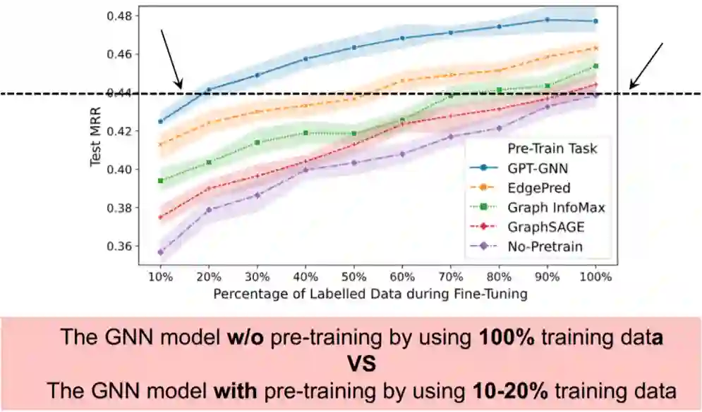 我们还评估了在不同百分比的标记数据下,GPT-GNN 是否依然能取得提升。我们可以看到,使用 GPT 预训练时,仅使用 20% 标签数据的模型性能就会比使用 100% 数据进行直接监督学习的模型性能更高。这显示了预训练的有效性,尤其是在标签稀缺时。
