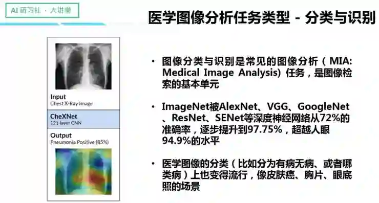 分类与识别:这是最简单最直接的任务类型。左边的图是吴恩达教授之前做的一个 X 光模型,这个模型中主要做分类,判断是否有肺炎等病症。图像分类与识别是常见的图像分析(MIA: Medical Image Analysis) 任务,是图像检索的基本单元。