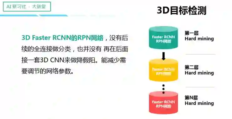 3D 目标检测在肺结节 CT 分析中的应用,表明目标检测的集成框架和方法除了可以用于比较浅层次的皮肤识别领域,还能在医学图像识别中比较大型的、难度比较大的场景中使用。肺结节识别采用的是 3D Faster RCNN 的 RPN 网络,它能减少需要调节的网络参数,既没有后续的全连接做分类,也不需要在后面接一套 3D CNN 来做降假阳。