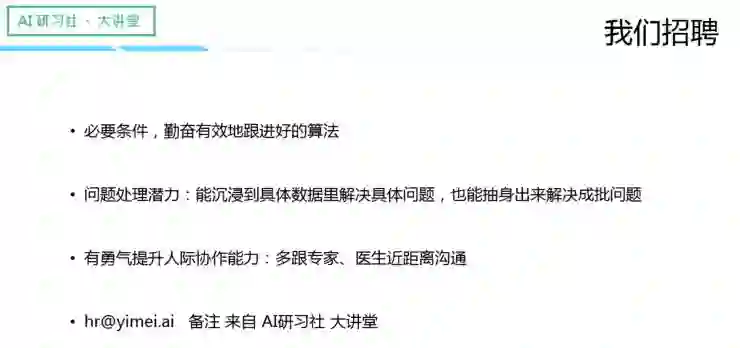 第一个,和医生协作的能力(这一能力与 EQ 有关)。传统的机器器学习中,往往只需要跟设备和代码打交道,而医学影像研发需要经常和医生沟通,把医生的思路不断地模拟成代码。其中的很多思路和方法都无法从论文里面得来,和医生的协作往往是 AI 研究人员需要具备的能力。