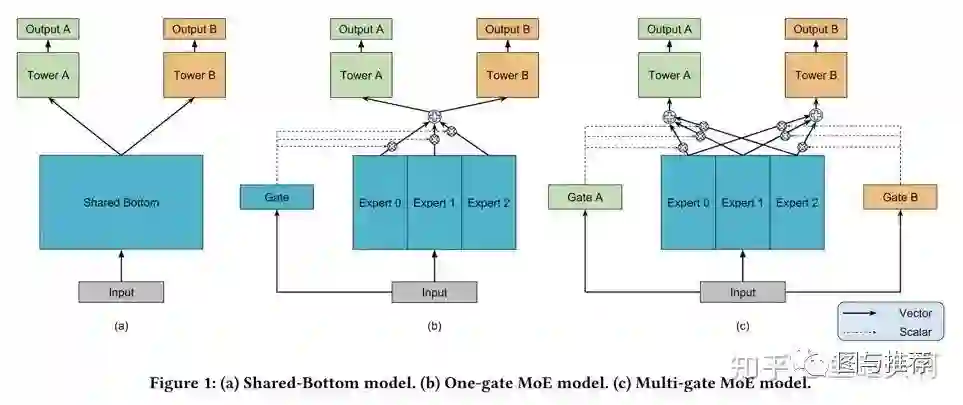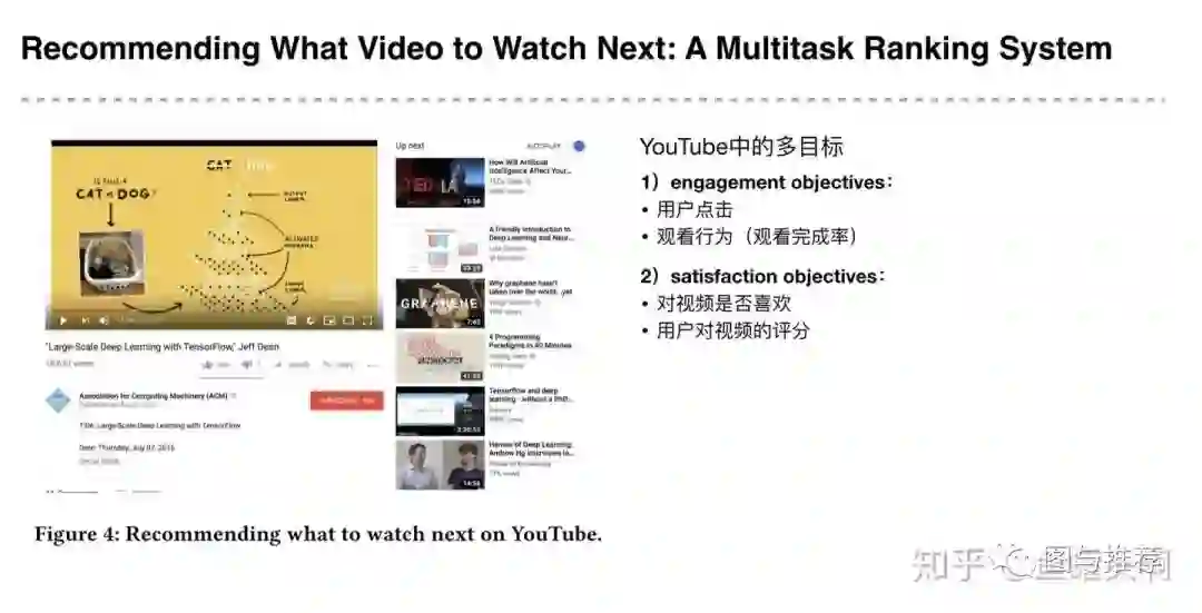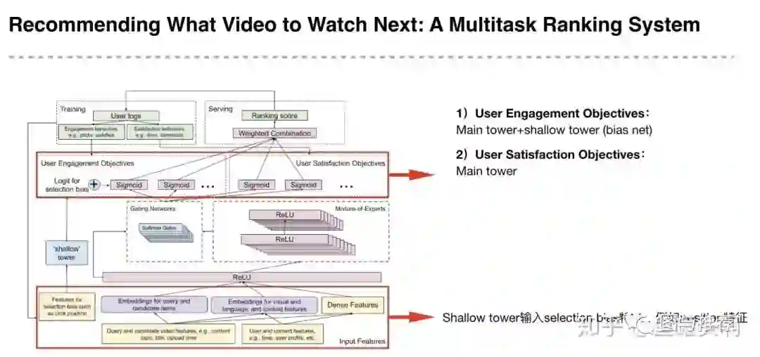 2017年的这篇综述文章An Overview of Multi-Task Learning in Deep Neural Networks将多目标的方法分成了两类。第一类是Hard parameter sharing的方法,将排序模型的底层的全连接层进行共享,学习共同的模式,上层用一些特定的全连接层学习任务特定的模式。这种方法非常经典,但是效果还是不错的,美团、知乎在18年分享的文章美团“猜你喜欢”深度学习排序模型实践、知乎推荐页Ranking经验分享使用的都是这种方法。img这种方法最大的优势是Task越多,单任务更加不可能过拟合,劣势是底层强制shared layers难以学得适用于所有任务的表达。尤其是两个任务很不相关的时候。这个视频里给出了生动的例子,假设你的多目标预估是同时做猫狗的分类,那么底层的shared layer 学到的可能是关于眼睛、耳朵、颜色的一些共同模式。img而如果你的任务是做一个狗的分类,同时做汽车的分类,采用Hard parameter sharing的方法,底层的shared layer 很难学到两者共同的模式,多目标任务也很难学好。img谷歌在MMOE论文中的实验显示,任务相关性越高,模型的loss可以降到更低。img当两个任务相关性没有那么好时(例如,推荐系统排序中的点击率和互动率,点击率和停留时长等),Hard parameter sharing 的模式就不是那么适用了,会损害到一些效果。对应的,Soft parameter sharing的方式可能更加适合。img广义上MMoE方法也是Soft parameter sharing的一种。MMoE的全称叫做Multi-gate Mixture-of-Experts,在这篇论文发表前,还有个MoE模型(Mixture-of-Experts),下面先介绍MoE模型。MoE模型的底层将shared layer变成了多个expert,同时设置了一个gate,不同的任务通过gate的输出加权各个expert的输出。img其中fi(x)为第i个expert网络的输出,g表示gate网络的输出。MMoE在MoE的基础上,设计了多个gate(每个任务都对应一个gate)。对于第k个任务,输出为对应的gate加权各个expert的输出,然后接多层全连接得到每个任务的输出。imgMMoE是Google发表在2018 KDD的一篇文章,在2019年的RecSys上,Google又发表了一篇MMoE的应用文章Recommending What Video to Watch Next: A Multitask Ranking System。算法的应用离不开其场景,这篇文章应用在Youtube视频推荐的场景中,其优化的多目标包含engagement objectives(点击率、完播率)和satisfaction objectives(喜欢、评分)。img详情页的场景大多都面临着各种bias问题。包括position bias,user bias,trigger bias等。position bias指的是不同坑位天然的xx率指标都不同;user bias表示着不同用户天然的xx率不同,有的用户爱点,有的用户不爱点;trigger bias表示这个内容出现在不同的详情页下,xx率也并不相同。Youtube这篇论文解决的是position bias的问题,下图以点击率为例,可以看出youtube的详情页场景的点击率面临着严重的position bias问题。imgYoutube解决这个问题使用的方式是使用一个shallow tower来建模xx率的position bias。这个shallow tower的输入特征只采用一些selection bias特征,结果加入到user engagement objectives中(Youtube认为这些指标的position bias比较大)。img这个shallow tower实际学到了什么呢?论文中将学到的position bias打出来了,发现确实,position靠前的坑位,值要更大一些。MMoE出来后,确实在工业界掀起了不小的水花,包括阿里在内的一些公司都对MMoE进行了改进,适配到自己的场景上,取得了效果。下面也想抛出一下自己的一些问题和想法,和大家讨论下。1.shallow tower放置在expert中是否更加合理?不同指标的position bias的严重程度可能不一样,在expert外学习统一的position bias可能不是十分合理。shallow tower放置在expert中是否更加合理?2.各个expert学到了什么?我们希望某个expert和task强相关,怎么办?Youtube的论文中,分析了不同expert和各个目标之间的关系(其实就是看各个gate的softmax值)。可以看到不同的expert确实在不同的任务中的重要性不同。但是这种expert和task的对应关系是随机决定的。而在一些情况下,我们需要某个expert和某个task之间存在强相关关系。这个时候可以在输入gate前,加入一些预设好的任务和expert权值关系,或者直接修改softmax函数,让占比大的更大。但这种方式比较粗糙,还有没有更加优雅的解决方式呢?img