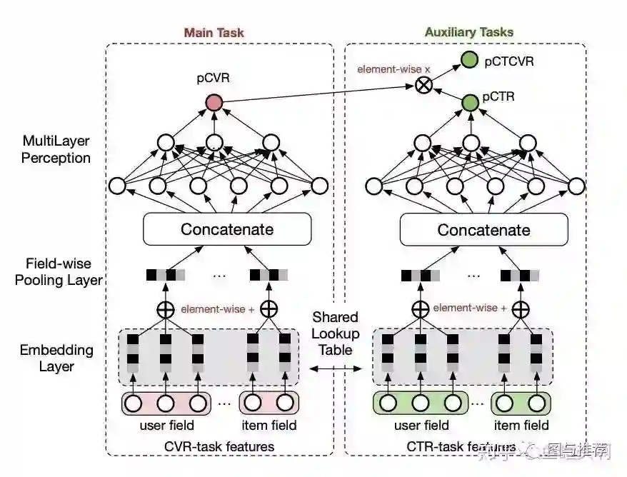 好了,是时候进入第二种范式了,我把它称之为任务序列依赖关系建模,代表作为阿里妈妈在2018年提出来的Entire Space Multi-Task Model (ESSM)。在推荐系统中,不同任务之间通常存在一种序列依赖关系。例如,电商推荐中的多目标预估经常是ctr和cvr,其中转换这个行为只有在点击发生后才会发生。这种序列依赖关系其实可以被利用,来解决一些任务预估中存在的样本选择偏差(Sample Selection Bias,SSB)和数据稀疏性(Data Sparisity,DS)问题。简单介绍一下什么是SSB问题和DS问题。SSB问题:后一阶段的模型基于上一阶段采样后的样本子集进行训练,但是最终在全样本空间进行推理,带来严重的泛化性问题。DS问题:后一阶段的模型训练样本通常远小于前一阶段任务。img事实上,通过观察下面公式中pctcvr、pctr、pcvr之间的关系,可以找到解决上面问题的方法。img上面公式可以转化为img那么,我们可以通过分别估计pctcvr和pctr,然后通过两者相除来解决。而pctcvr和pctr都可以在全样本空间进行训练和预估。但是这种除法在实际使用中,会引入新的问题。因为pctr其实是一个很小的值,范围一般在百分之几,预估时会出现pctcvr>pctr的情况,导致pcvr预估值大于1。imgESSM巧妙的通过将除法改成乘法来解决上面的问题。它引入了pctr和pctcvr两个辅助任务,训练时,loss为两者相加。imgESSM是一种较为的通用的任务序列依赖关系建模的方法,除此之外,阿里的DBMTL 、ESM^2等工作都属于这一范式。