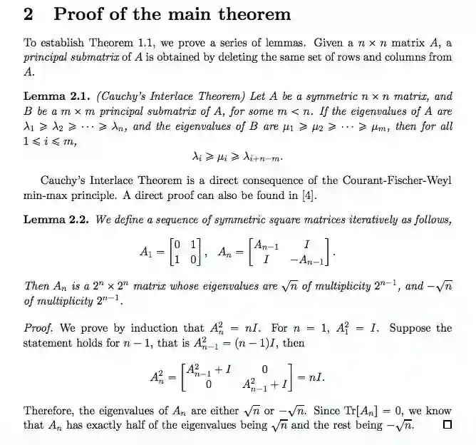2018 年,黄皓决定使用柯西交错定理(Cauchy interlace theorem),该定理将矩阵特征值和子矩阵特征值关联起来,因此成为研究立方体及其尖角子集的完美工具。黄皓决定向美国国家科学基金会提交申请,以进一步探索这一思路。
