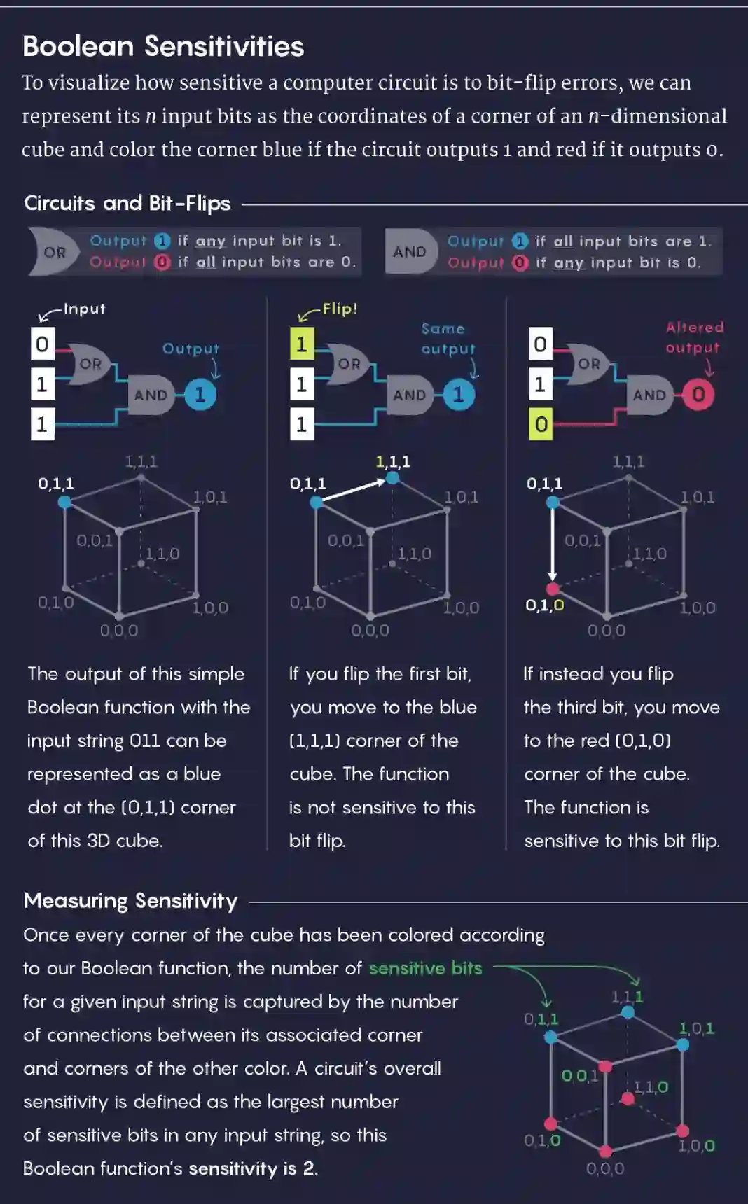 例如,有四个两位字符串 00、01、10 和 11,分别对应二维平面中正方形的四个角:(0,0)、(0,1)、(1,0) 和 (1,1)。同样,八个三位字符串分别对应三维立方体的八个角……以此类推。布尔函数可以被认为,用两种不同颜色为这些角进行着色的规则(比如为 0 涂红色,1 涂上蓝色)。