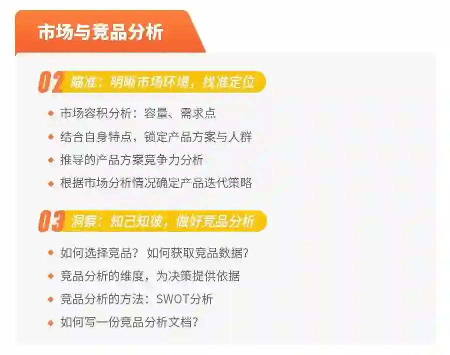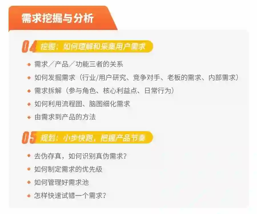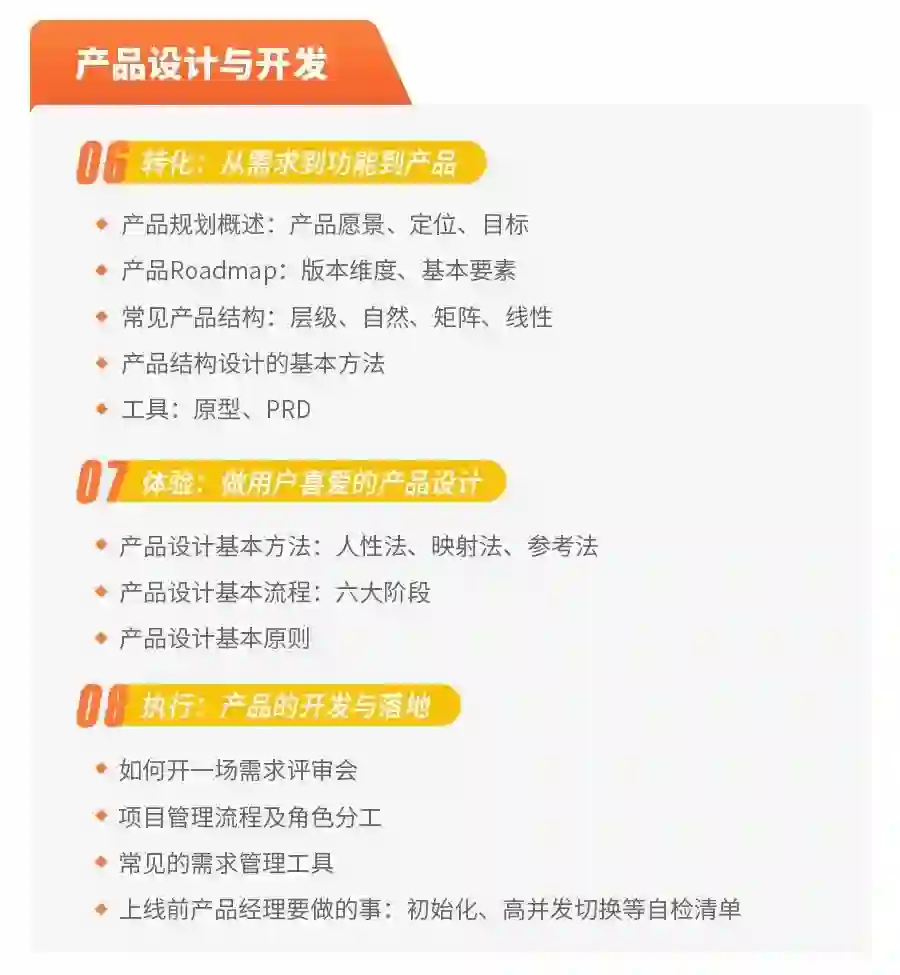 这门课程结合了大厂产品经理成长体系以及产品经理实际技能应用,系统地覆盖了产品知识核心6大板块,供大家体系化的学习参考。