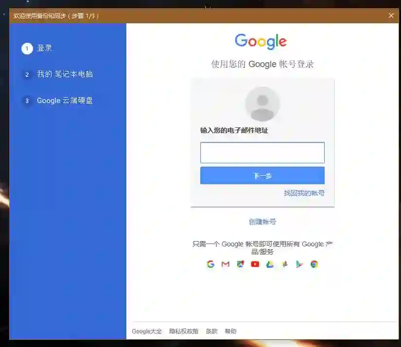 安装完毕打开「Google 推出的备份和同步功能」,首先会进入设置向导页面,第一步当然是登录你的 Google 账号。