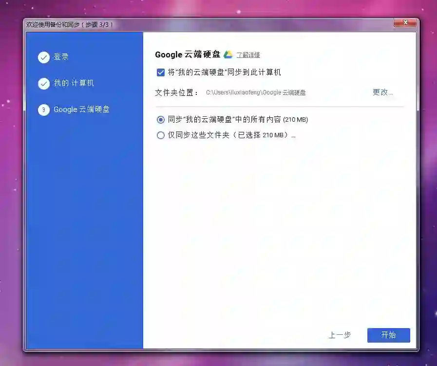 而在最后一个步骤中可以选择是采用双向同步还是仅仅只是将本地文件单向同步至云端(如果之前使用过 Google 云端硬盘需要注意设置),最后点击「开始」等待状态栏中数据上传即可。