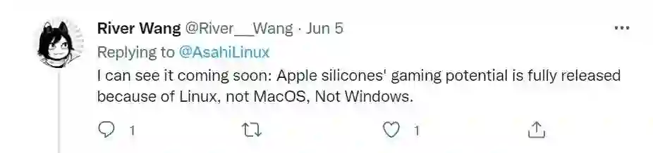 推特上不少用户也表示对这样的进展喜闻乐见,纷纷感叹 Asahi Linux 团队进展之神速。正如用户 River Wang所说:“在不远的将来,我可以看到基于苹果芯片的游戏潜力被完全释放,而这正是因为 Linux,而不是 macOS,也不是 Windows。”