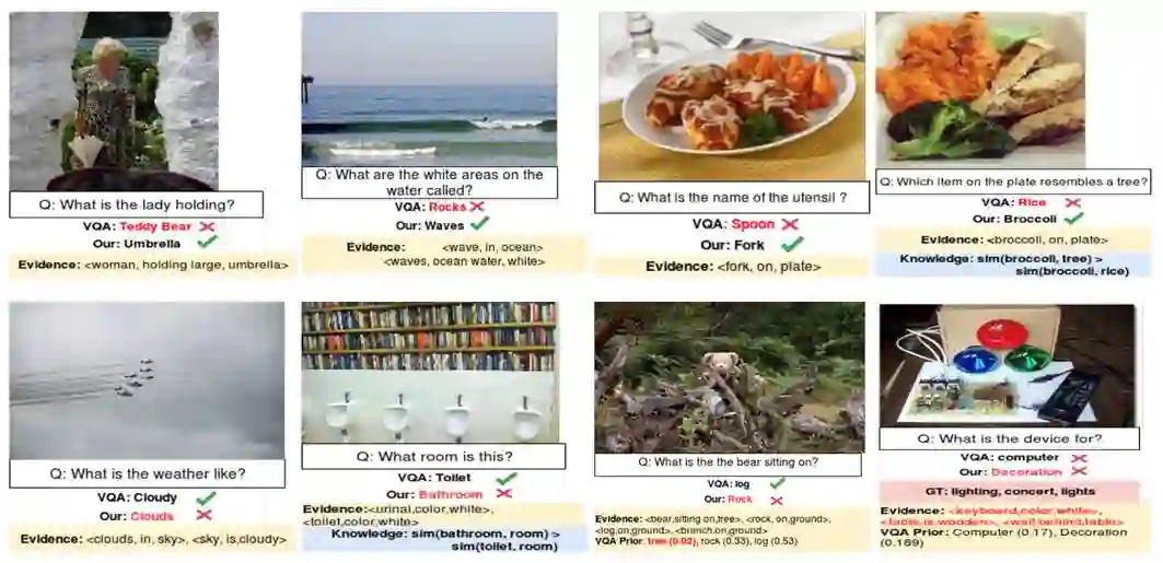 本文提出的主要模型,是一个基于一阶谓词概率软逻辑(Probabilistic Soft Logic)的显式推理机. 如果你已经训练好了一个用于视觉问答的神经网络模型,那么这个显式推理机可以根据模型的输出结果, 综合考虑信息后,更正原本模型的输出结果. 这样的后处理能提升模型的精度.下图就是一个这样的例子.