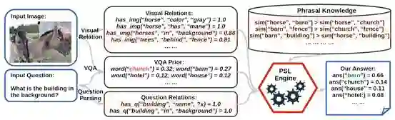图 1 中红色六边形标示的 “PSL Engine”, 是显式推理的核心部分.通过这一个部分, 将 “VQA” 的预测结果与” Visual Relation(视觉关系)”,“Question Relation(问题关键词关系)”和”Phrasal Knowledge(语言常识)”三部分信息综合起来,进行推理, 更新答案. 此处是一个正向例子.