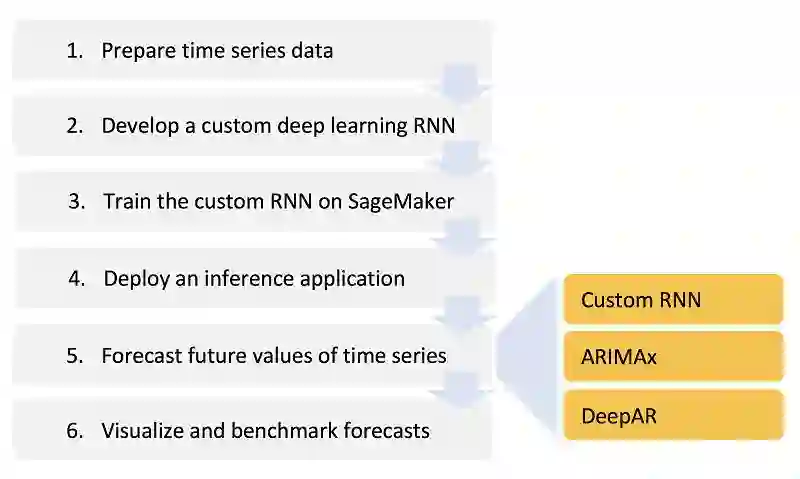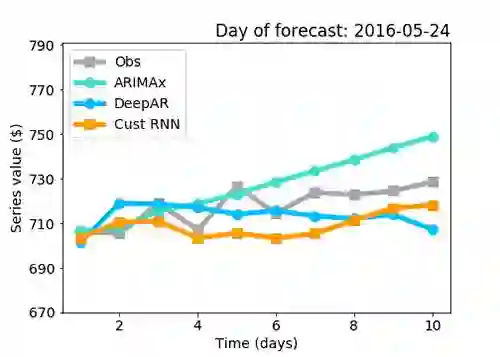 This blog post shows you how to develop a deep learning RNN architecture and customize it for a specific use case, implement two additional forecasting methods, ARIMAx and DeepAR, and benchmark performance results using the Amazon SageMaker elastically scalable and production ready environment. The use case chosen here was forecasting the future time evolution of a financial time series based on the past trends of this series as well as the past trends of multiple other factors, namely other time series values and overall market sentiment. The code in attached file can be adapted to other use cases and other time series with minimal changes.