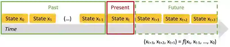 Forecasting the dynamics of sequential events, i.e. time series, can be carried out using different methods depending on how much detail we know on the probability distribution of the data we aim to forecast. Fitting a probability distribution to the data enables to formulate past and future trends of a time series simply as the results of a parametric equation. If we had a perfectly known probability function for all quantities we aim to forecast, for a given initial value all solutions at all times could be found (Fig.2). For example, when trying to predict a stock value, if we knew all factors that influence this stock and could formulate a probability function that governs the relationship between all these factors, this function would tell us everything we want to know. Of course, we almost never have this function. So we use numeric approximation (Fig.2), by discretizing time into small intervals and computing the evolution of values (called states) one after the other based on available information. Information generally used to predict the future includes trends within the past evolution of states, randomness (i.e. variability around trends) and boundary conditions (e.g. origin of an epidemic, strike price of an option).