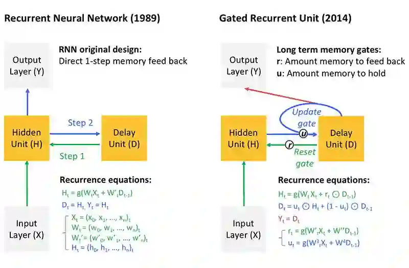 Figure 3: Architecture of recurrent neural networks and gated recurrent units (GRU) that help solve vanishing memory issues as explained in the text