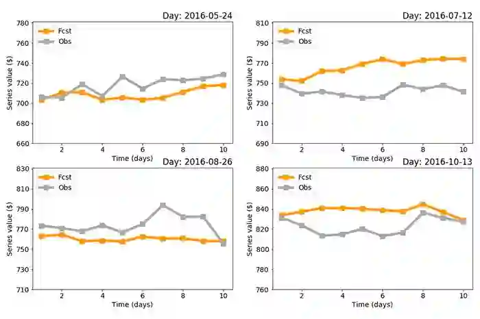 In our example, we kept 10% of the original time line for validation purposes, which corresponds to the period from May to December 2016, and uniformly sampled 4 pairs of non-overlapping lag-horizon pairs during this period to capture a diverse set of observed trends. For each sample Fig.4 compares the 10-day forecasted horizon with the actual, observed values. The mean absolute error (MAE) was used to penalize the magnitude of the error independently of its sign, and preferred to mean squared error (MSE) because we are more interested in trends over multiple points than in how large a particular point’s error might be. MAE for each sample is respectively $10, $24, $14, and $15. That’s $16 on average, which corresponds to MAE < 3% relative to SERIES A values. Note the news headlines data was not available after 7/1/2016 in the Kaggle dataset so only the first sample uses this feature, which the RNN combo elegantly accommodates without having to change its architectural design.