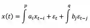 In the case of ARIMAx, which is ARIMA adapted for the inclusion of co-factors, a prediction at time t is made by regressing a target time series on (i) some lag p of the time series itself and other related time series, which is the deterministic part, AR, and (ii) some lag q of random fluctuations around the moving average along the time series itself and other related time series, which is the stochastic part, MA. In equation this gives: