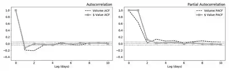 where x is a set of time series, e the random fluctuation around the time series moving average and (a,b) the weighting parameters (same concept as weights in standard regression models). The time series can be differenced (i.e. integrated) by any order to make them stationary before to apply AR and MA, hence the name AR-I-MA. The x suffix stands for exogenous variables, which here are simply the other four related time series (SERIES A volumes, SERIES B values and volumes, sentiment) after we shift the dates in the past by a number of time steps corresponding to the horizon, see code in attached files. As shown in Fig.5, the SERIES A values do not seem auto-correlated with the previous 2 time steps, but both the SERIES A volumes and volatility (as modeled by the MA term in the earlier equation and accounted for in the partial auto-correlation function (PACF) curve) are auto-correlated beyond white noise up to 3 time steps.