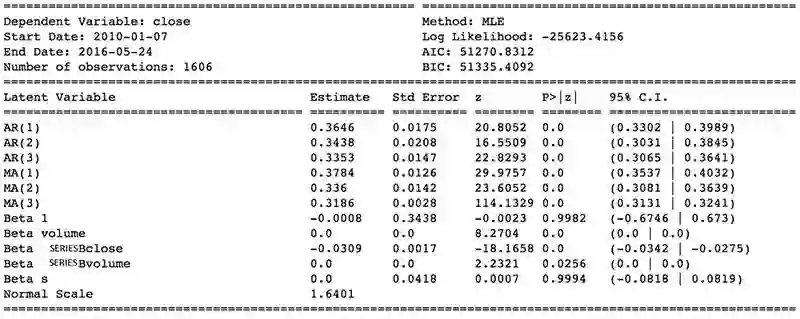 In Fig. 6 we see a key benefit of ARIMA in forecasting time series, which is to provide a linear mapping between input and output with a set of weights (see column Estimate) that can be used to assess the importance of each input time series. In particular, we see the SERIES B values significantly impacts forecasts made for SERIES A values. The market sentiment (s) does too but to a lower extent, and volumes are relatively insignificant for the purpose of forecasting the SERIES A values with ARIMAx. In Fig.7 we see a key limitation of ARIMA: It is a linear forecasting approach and tends to not generalize well when trends are significantly non-linear. In our example, we see that the forecasts from ARIMAx remain quantitatively reasonable after 10 days but completely miss daily and other micro-cyclic trends which could lead to high errors if these micro-cycles were more pronounced or if the target horizon was larger than 10 days.