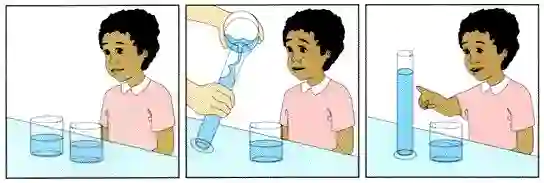 如果你在屁孩儿面前放两个形状不同的杯子,一个胖矮,一个细高,然后把同样多的液体倒入两个杯子中,问屁孩儿哪个杯子中的水多?他们直指那个细高的。