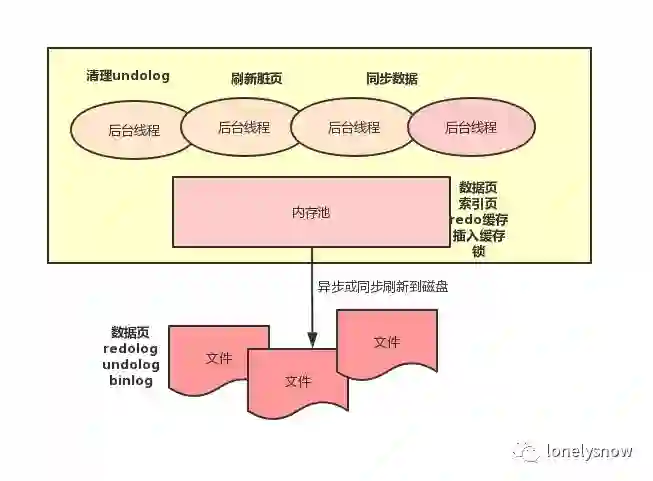 在执行更新逻辑的时候还会写入另外一个日志:undolog 。这个文件存储在共享表空间中,也就是即使打开了 innodb_file_per_table 参数,所有的表的 undolog 都存储在同一个文件里。该文件主要用来做事务回滚和 MVCC 。undolog 是逻辑日志,也就是他不是记录的将物理的数据页恢复到之前的状态,而是记录的和原 sql 相反的 sql , 例如 insert 对应 delete , delete 对应 insert ,update 对应另外一个 update 。事务回滚很好理解,执行相反的操作回滚到之前的状态,而 MVCC 是指镜像读,当一个事务需要查询某条记录,而该记录已经被其他事务修改,但该事务还没提交,而当前事务可以通过 undolog 计算到之前的值。这里我们只需要知道和 redolog 一样, undolog 也是需要在执行 update 语句的时候在事务提交前需要写入到文件的。另外 undolog 的写入也会有对应的 redolog ,因为 undolog 也需要持久化,通过 WAL 可以提高效率。这里可以总结下,在事务提交的时候要保证 redolog 写入到文件里,而这个 redolog 包含 主键索引上的数据页的修改,以及共享表空间的回滚段中 undolog 的插入。另外 undolog 的清理通过一个后台线程定时处理,清理的时候需要判断该 undolog 是否所有的事务都不会用到。