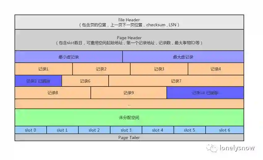 数据页头( Page Header)固定 56 个字节 包含slot数目,可重用空间起始地址,第一个记录地址,记录数,最大事务ID等