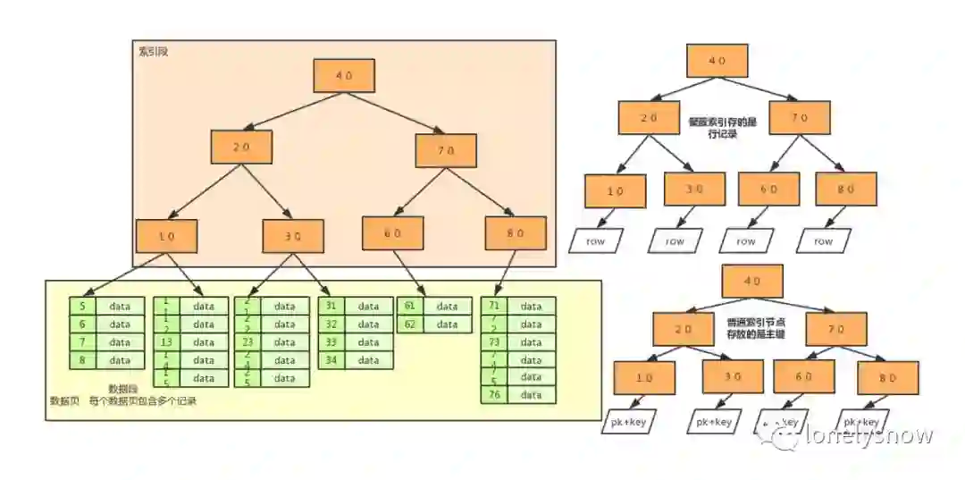 InnoDB 中,有聚簇索引和普通索引之分,聚簇索引根据主键来构建,叶子节点存放的是该主键对应的这一行记录,而普通索引根据申明这个索引时候的列来构建,叶子节点存放的是这一行记录对应的主键的值,而普通索引中还有唯一索引和联合索引两个特例,唯一索引在插入和修改的时候会校验该索引对应的列的值是否已经存在,而联合索引将两个列的值按照申明时候的顺序进行拼接后在构建索引。