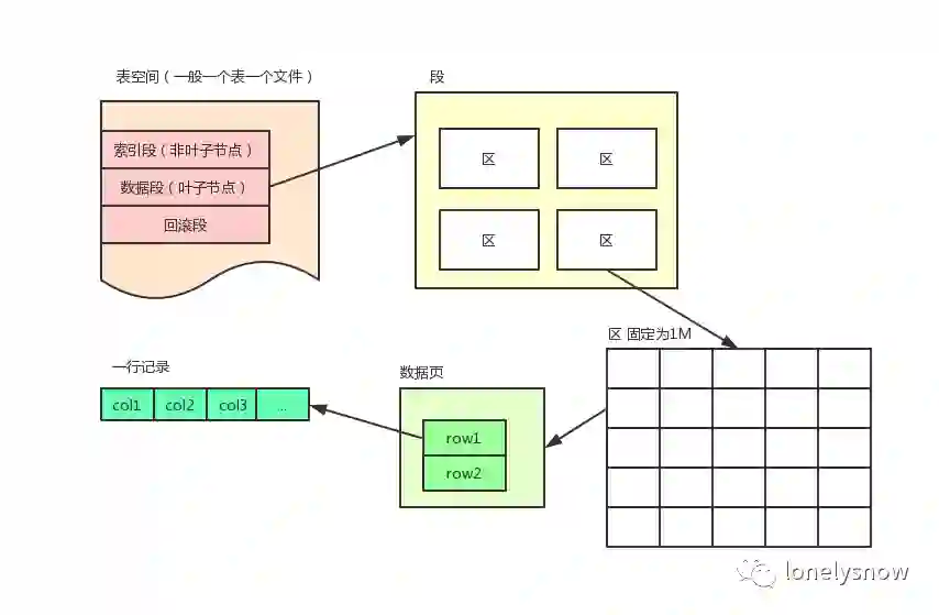 有了以上的索引知识我们在来分析数据是怎么存储的,InnoDB 存储引擎的逻辑存储结构从大到小依次可以分为:表空间、段、区、页、行。