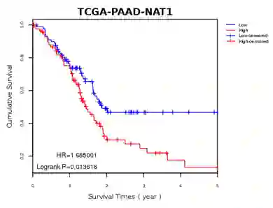 图1 比较了Low和High两组之间的生存时间分布。HR是风险比,指的是实验组(High)所产生的风险率与对照组(Low)所产生的风险率的比值;Logrank指的是生存分析所使用的显著性检验方法。
