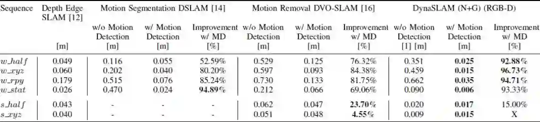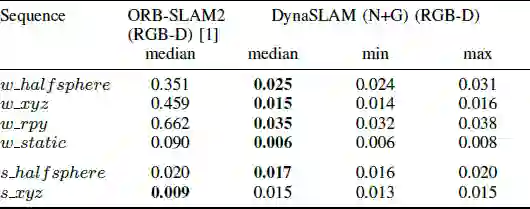 DynaSLAM (N)代表仅使用Mask RCNN进行动态物体分割; DynaS LAM (G)代表仅使用基于深度变化的多视几何进行动态检测和分割;DynaSLAM (N+G)代表同时利用多视几何和深度学习的方法进行检测;DynaSLAM (N+G+BI)代表在背景修复之后进行跟踪和建图的操作(这时是基于真实影像和重建影像完成ORB特征提取)。从表中可以发现使用DynaSLAM(N+G)的精度是最高的,DynaSLAM (G) 由于在经过一定的延迟之后运动估计和实例分割才会准确这一方法特性,使得最后的精度较差。DynaSLAM (N+G+BI)由于使用了重建之后的影像进行跟踪,而相机姿态会对重建影像有较大影响,因此这样的效果比较差。